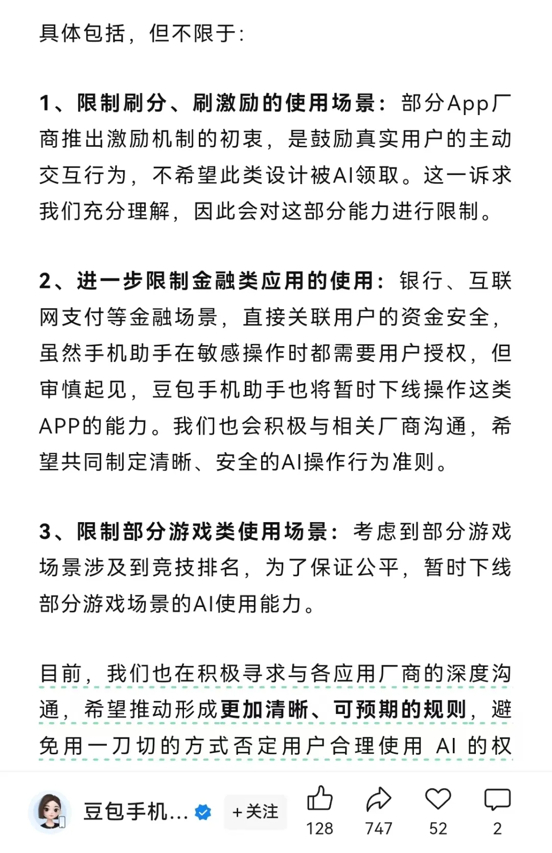 On December 5th, only four days after the release of the Doubao Mobile Assistant, an official "Statement on Adjusting AI Mobile Operation Capabilities" was released, specifically restricting its use in game scenarios involving "score grinding, incentive grinding" and "competitive rankings." We believe this directly corresponds to the two impacts proposed in this article: "hollowing out player engagement" and "replacing authentic competitive behavior."