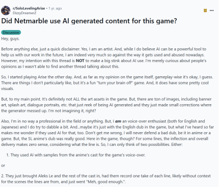 NEXON's controversy is not an isolated case. For instance, fellow South Korean gaming giant Netmarble faced heightened player skepticism when launching a new title based on the globally popular IP “I Level Up Alone.” After the game's release, numerous players posted on social platforms like Reddit, pointing out that many in-game art assets—including character portraits and cutscene illustrations—exhibited clear signs of AI generation, such as inconsistent detail handling, blurred texture blending, and illogical linework.