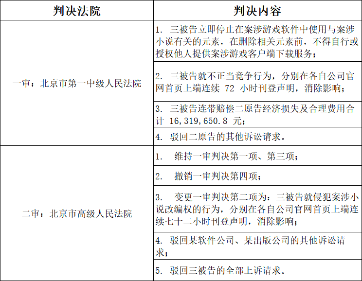 The court of first instance held that the game did not use the core expression of any single novel, nor did the proportion of expression from any individual novel reach a level sufficient to establish correspondence as a whole. Accordingly, the court found that the game did not infringe the plaintiffs’ adaptation rights.