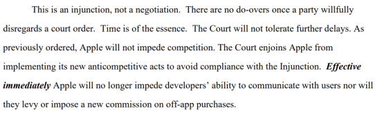 The court emphasized that the injunction took immediate effect, and Apple was required to promptly adjust its relevant policies to comply with the ruling.