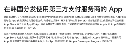 On August 31, 2021, the Korean National Assembly passed the Enforcement Decree of the Telecommunications Business Act. Annex 4, Article 8 updated the definition of unfair conduct by app stores, including refusing, delaying, or restricting the use of payment methods other than designated payment systems. South Korea became the first country to require app stores to allow apps to integrate third-party payment systems.