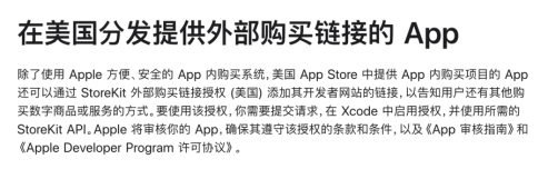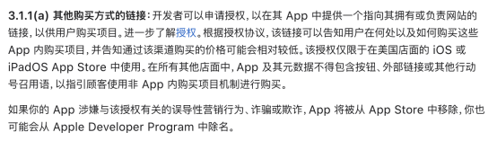 Since 2017, Apple has clearly stated in the App Store Review Guidelines that, except for special authorization in the United States, apps and their metadata must not include buttons, external links, or other calls to action that direct customers to use purchasing mechanisms other than in-app purchases. Apple reserves the right to remove apps that guide payments from the App Store or terminate developer accounts.