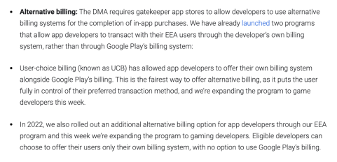 Google Play has similarly stipulated in its Developer Program Policies that, except for special payment purposes where the Google Play billing system is not required, or where alternative in-app billing systems are permitted in specific countries or regions, apps must not direct users to payment methods other than the Google Play billing system.