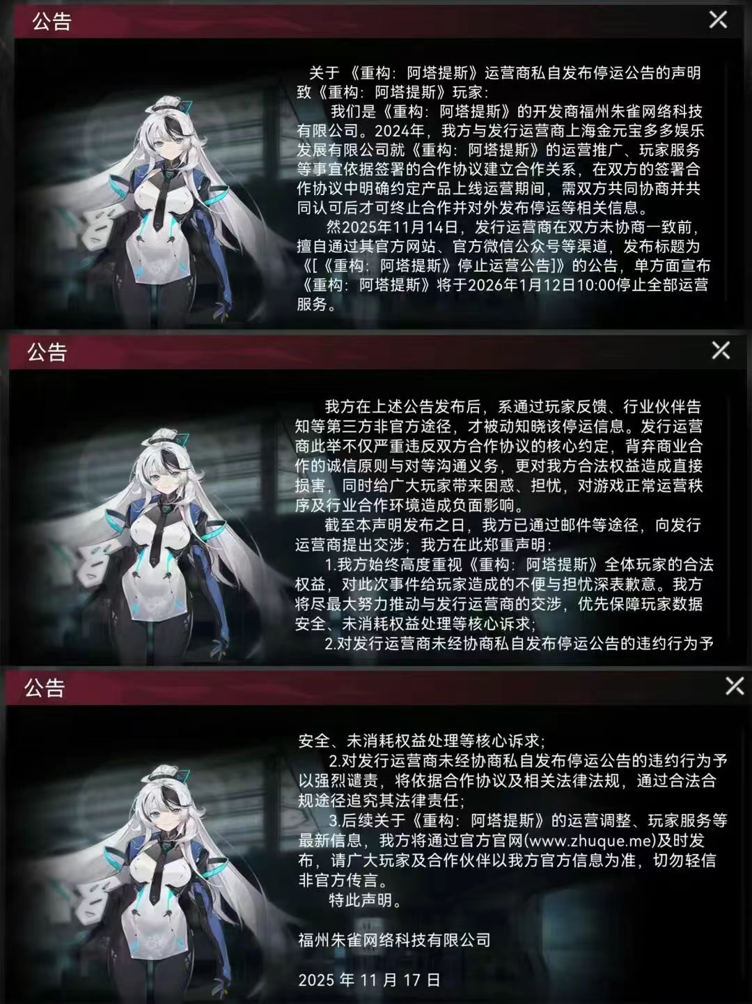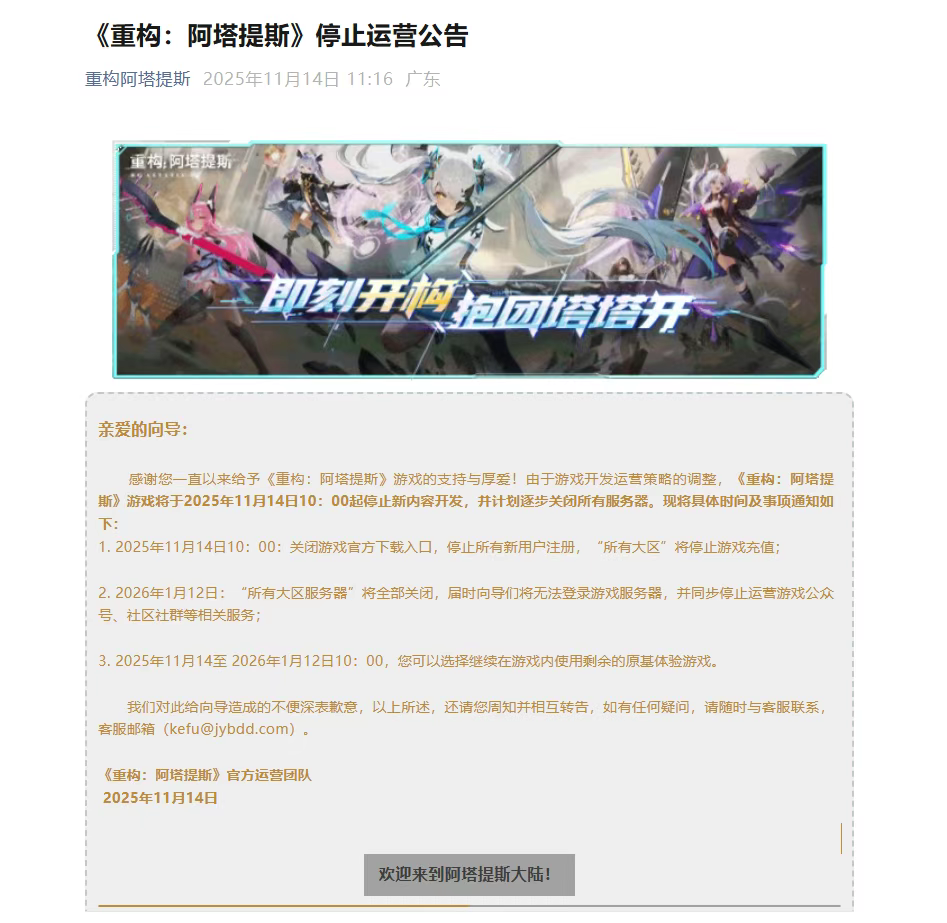(图为发行方发布的《重构:阿塔提斯》停服公告)