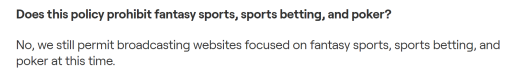 Based on Twitch’s current official policies, the platform still permits the dissemination of content related to fantasy sports, sports betting, and poker websites.
