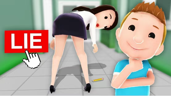 The Perfect Lie advertisement included animated depictions of a student and a female teacher. The teacher approaches the blackboard and bends over, with her buttocks appearing pixelated. Two options are then displayed: “Look away” and “Watch her A**.” The second option is selected, followed by a text bubble stating “Did you just check me out?” The student character appears to be under the age of 18.