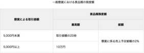 Restrictions on prizes offered through lotteries stipulate that the maximum value of any single prize shall be capped at 20 times the transaction amount and shall not exceed 100,000 yen. Additionally, the total value of all prizes offered shall not exceed 2% of the total transaction amount.