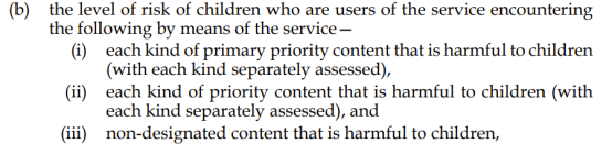 Under the Act, all regulated services owe a duty of care in respect of illegal content. Where a service is likely to be accessed by children, it also has a duty to protect children from harm. Online services involving children will be subject to risk assessments across three categories (primary priority / priority / harmful), depending on user scale and service functionality. The objective criteria for these categories will be set out in secondary legislation.