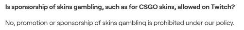 In a statement to Dexerto, Twitch indicated that this move is related to renewed user interest in CS:GO skin gambling. Twitch stated, “CS:GO skin gambling has once again garnered widespread attention, so we have explicitly clarified in our FAQ that promotion or sponsorship is not permitted.”