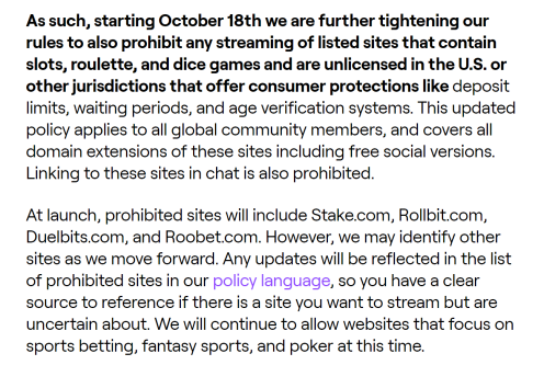 Based on Twitch’s current official policies, the platform still permits the promotion of fantasy sports, sports betting, and poker websites.
